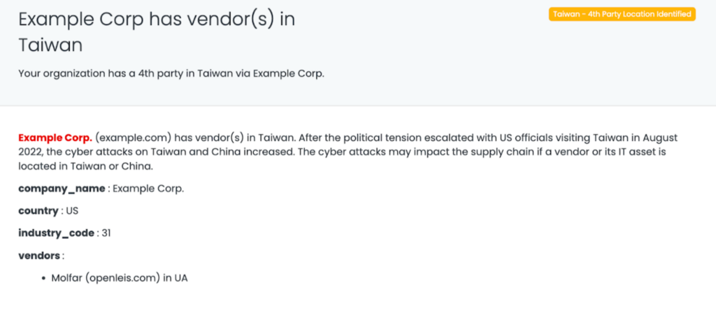 Due to increasing tension between China and Taiwan after Speaker of the United States House of Representatives Nancy Pelosi’s visit, we have observed many cyber attacks between the two countries. Vendors in these countries or vendors with an IT asset in either of these countries pose an increased cyber risk within the supply chain. As a result, our customers have requested FocusTags™ dedicated to the China-Taiwan conflict.