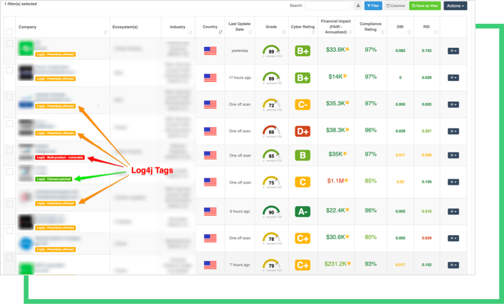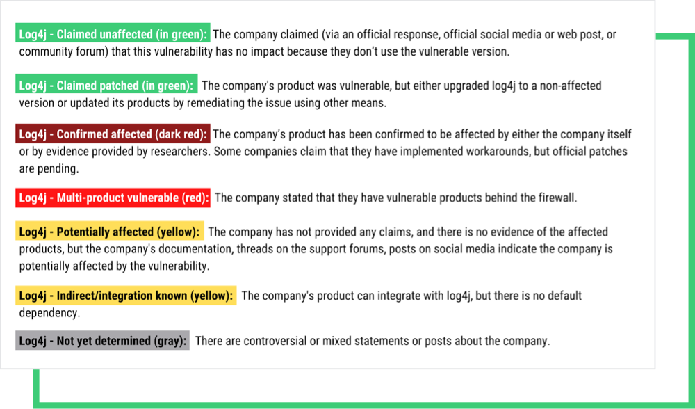 Companies are identified in the Black Kite platform using ‘Tags’ based on their publicly-posted Log4j status (See details below).
