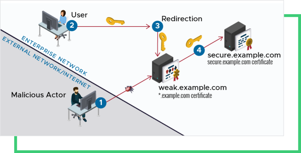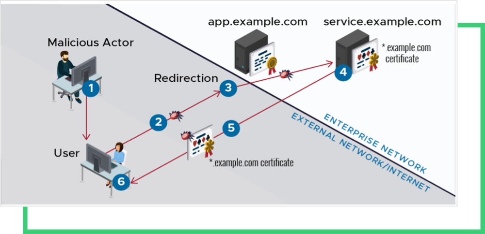 - When an enterprise user requests an application of an internal server at enterpriseapp.example.com through TLS, the malicious actor redirects the request to vulnerable.example.com.