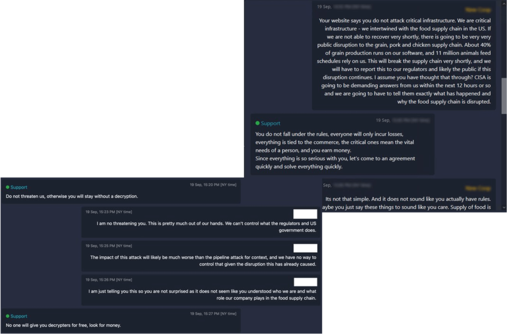 The post above is no longer available, indicating negotiations are underway. Current negotiation details are exposed on Twitter by a user called Dark Feed [3] and some other Twitter users [4] to a more general audience. The message exchange between the threat actors and negotiator on behalf of the company focuses more on whether NEW Cooperative can be considered an off-limit critical infrastructure by BlackMatter’s own standards.