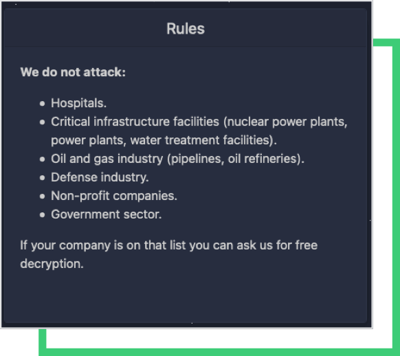 The rules posted on BlackMatter’s blog state that they do not attack hospitals, critical infrastructures, oil and gas, defense, NPOs, and government. The group gives examples of the critical infrastructure as “nuclear power plants, power plants, water treatment facilities” and examples of the oil and gas industry as “pipelines, oil refineries.” The group also ensures that they give free decryption keys if the targeted company falls under these categories. NEW Cooperative considers itself as critical infrastructure (for the food supply chain) and has asked for free decryption. However, BlackMatter feels otherwise and has still asked for the ransom to be paid.