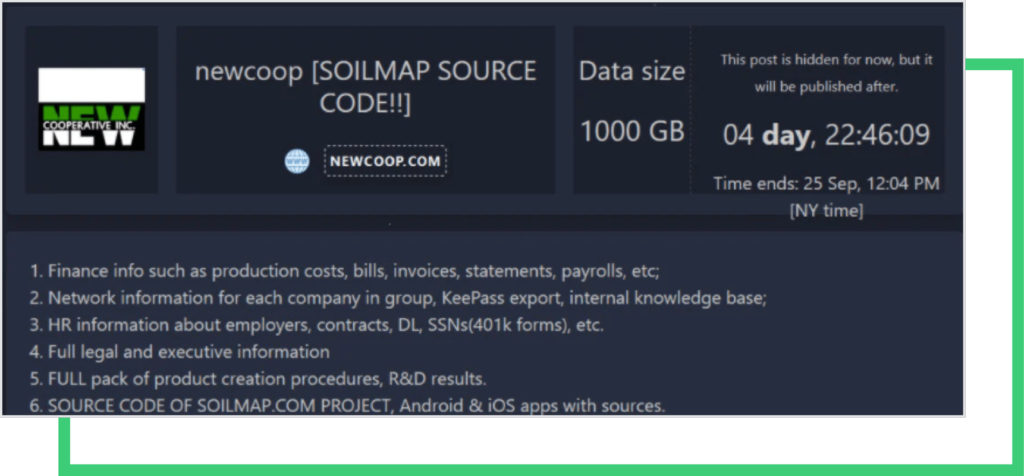 The BlackMatter ransomware group posts victim information to its blog as a threat to leak stolen data and not provide a decryptor. NEW Cooperative’s name appeared in this blog last week, with a countdown that ends on September 25 at 12:04 PM. To prevent BlackMatter from leaking 1000GB of stolen sensitive data, the initial ransom demand is $5.9 million. If the ransom is not paid by the deadline, the group threatens to increase the ransom to $11.8 million. Past ransomware negotiations show, however, that the paid ransom is usually significantly lower than the starting point. If NEW Cooperative decides to pay the ransom, it might be much lower than the initial amount requested.