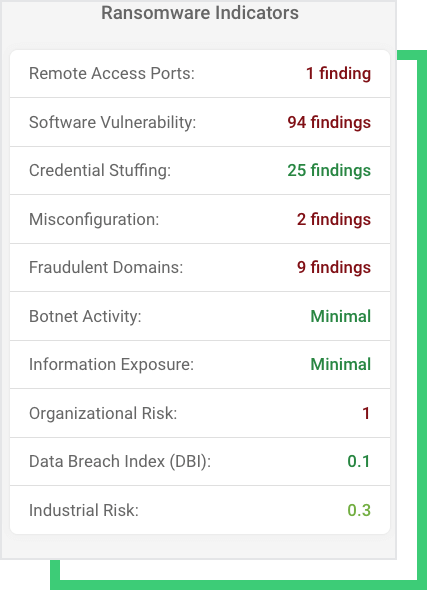 Black Kite Research analyzed hundreds of ransomware events and related reports in order to generate a list of ransomware indicators for a company, as well as identified the eight most common indicators to be used for ransomware risk management. Black Kite’s patent-pending Ransomware Susceptibility Index® follows a process of inspecting, transforming, and modeling data collected from a variety of OSINT sources (internet-wide scanners, hacker forums, the deep/dark web and more). Using data and machine learning, the correlation between control items is identified to provide a ransomware susceptibility rating on a scale from 0.0 (less susceptible) to 1.0 (more susceptible)*. Contact us for your free RSI™.