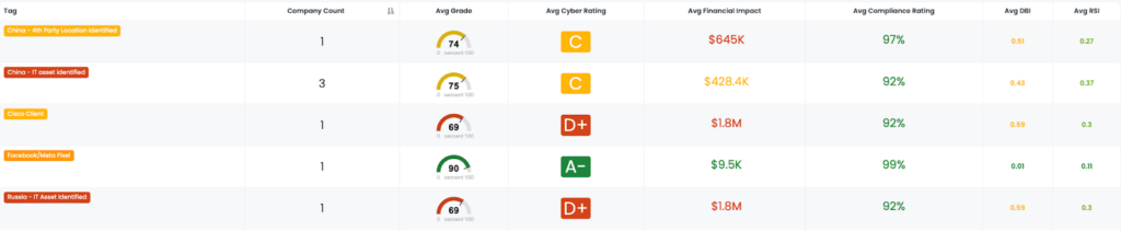 The majority of the companies with low ratings also have particular alerts for Focus Tags™. FocusTags™ were built to identify vendors within an ecosystem that have experienced a recent high-profile cyber event or have IT assets in countries like China, Russia, and the Ukraine. Below are a few examples of sponsor companies in South Korea that are associated with various cyber events and assets.